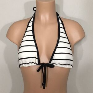 Tying at the front to shift the design, Kate Spade New York's halter bikini top is a sensation in chic, two-tone stripes. Ivory and black. Made of high-quality fabric. The lining is made of buttery soft fabric.