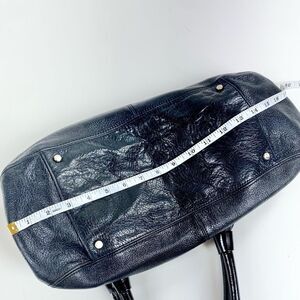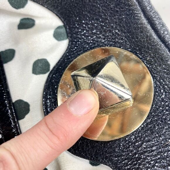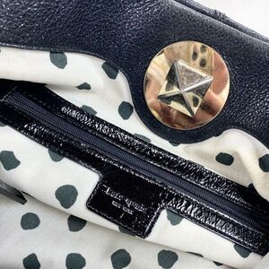 Kate Spade black leather shoulder bag w/ patent straps & gold twist clasp. Black and white polka dot lining. Three compartment design with center zipper. Bag is soft and has some signs of wear, but in really good condition. Scratches to the clasp, and one small stain near the interior zip pocket, both pictured.