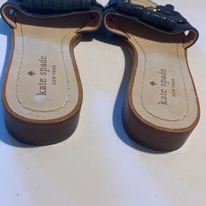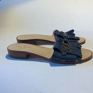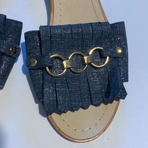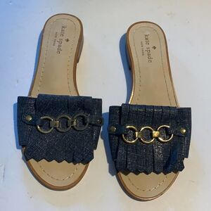 Kate Spade Brie Metallic denim flats with gold chain detail and fringe. Open peep toe and small wood square heel. EUC