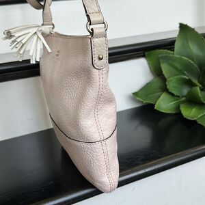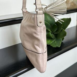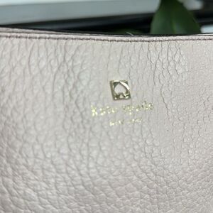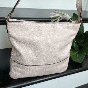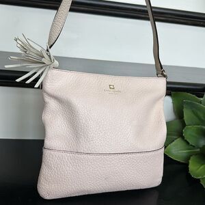 The leather on this Kate Spade Crossbody is soft and luxurious with a beautiful pebbled finish. The neutral coloring makes this bag perfect no matter the season and easy to grab and go. This purse has no heavy hardware and has beautiful, shiny gold-tone accents. The Crossbody shoulder strap is adjustable and has no cracks or peeling. The Kate Spade emblem and logo is on the front top of this neutral handbag. The top of the bag has a strong and secure, zipper with cute genuine, leather tassel and opens to a black and white striped fabric inside. The inside of this bag is clean with a zipper pocket and two open pockets for organizing. Non-smoking and like new. Soft and luxurious. Slight blush hue at times (kind of depends on lighting). Neutral clean