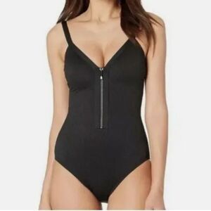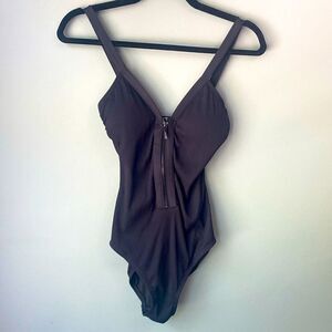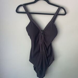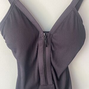 Ribbed bathing suit with zipper front detail . Padding and adjustable straps