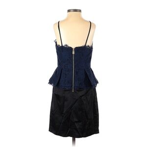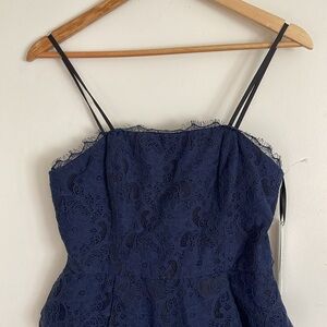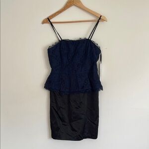 Kate Young Blue Floral Lace Black Satin Spaghetti Strap Peplum Cocktail Dress