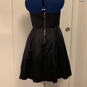 Super cute black strapless dresss. Satin like exterior. Beautiful accent bow on the chest. And it has pockets!!!