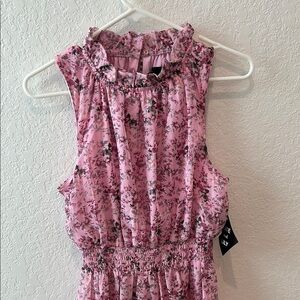 Chic pink floral sleeveless dress with ruffled neckline. Perfect for any occasion.