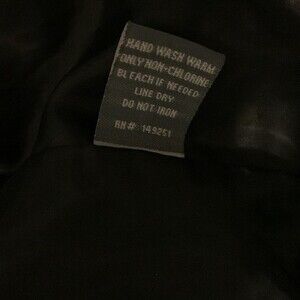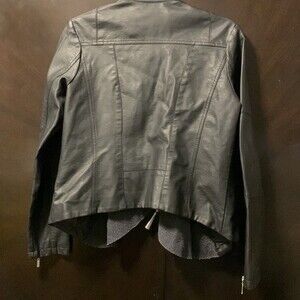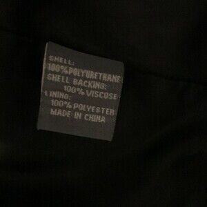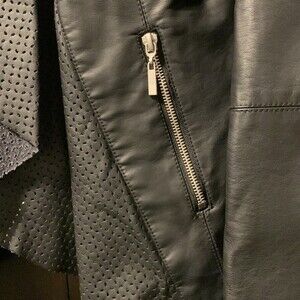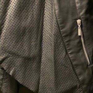 Amazing jacket by Kate & Mallory. Front of the jacket is still the leather feel, but is more of a mesh. All zippers are in working condition. The jacket shell is 100% polyurethane. The shell backing is 100% viscose, and the lining is 100% polyester. Beautiful condition with no holes, tears or stains. Great price and product!