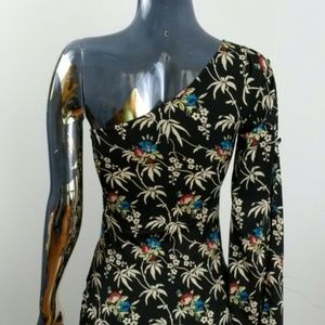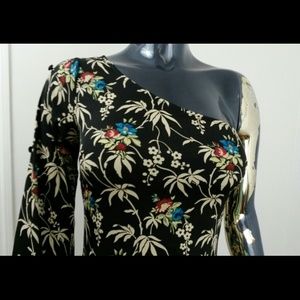 Black in color with floral prints, one shoulder cut out sleeve with buttons
