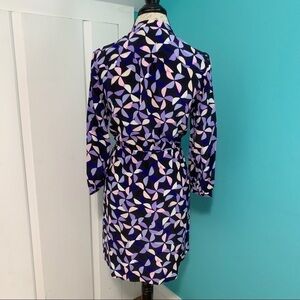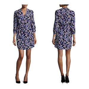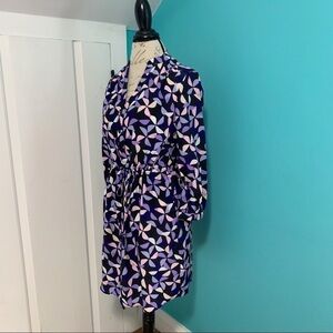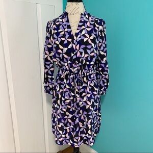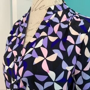 “Spinner” shirtdress featuring a slightly abstract pinwheel pattern in lilac, pink, cobalt, blush and white. Color is technically called: Nightlife Blue. Banded collar with v neckline; concealed Button front. 3/4 Sleeves; button cuffs. Drawstring waist; blouson bodice. Yoked back shoulders. A-line skirt. Arched hem. Unlined. 100% Silk. Dry clean only. Measures approximately: 18 1/2” armpit to armpit, 25” armpit to hem, 12 1/4” from armpit to cuff, 34 1/2” shoulder to hem. Excellent condition.