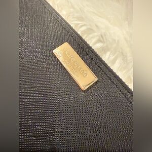 This Kate Spade Neda zip around wallet is a stylish designer accessory for women. Made of black leather with gold hardware accents, this wallet features a zip-around closure and multiple credit card slots for organization. The sleek and solid design makes it a versatile and practical choice for everyday use.
