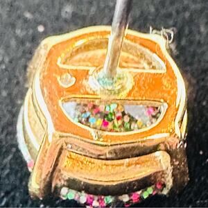 These stud earrings feature a round, glitter-filled design set in a gold-tone prong setting. Kate Spade, established in 1993, is known for combining sleek shapes and colorful palettes in its designs.