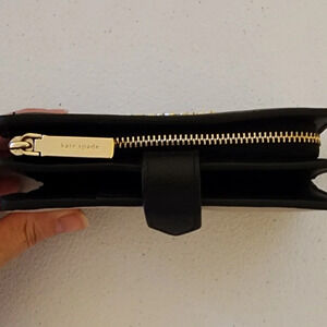 3.7" h x 4.4" w x 1.1" d saffiano ksny metal pinmount logo two way spade jacquard lining interior: 6 credit card slots, bill fold, zip around coin compartment with center divider exterior: id window slip pocket snap & zip closure dust bag not included