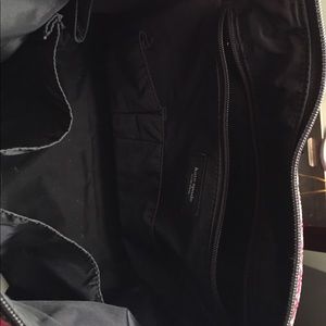 Authentic Kate spade Red signature shoulder bag with Kate spade logo design. Shoulder strap adjustable to wear cross body or regular. nylon interior with several pockets zipper pocket has Kate spade tag main zipper closure. Bottom corners of bag show slight wear from being placed down. Measures 10 inches tall without strap approx 16 inches across. Large interior plenty of space bottom metal grommets stamped with logo. In excellent used condition. Great every day bag. Purchased at Saks in Boston