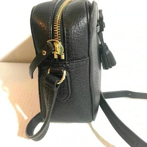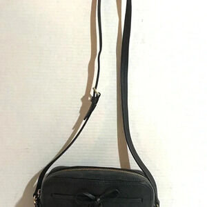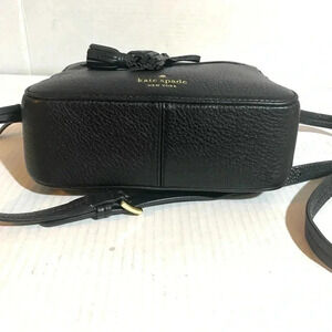 Kate spade black leather crossbody handbag with gold tone hardware main compartment 1 zip pocket closure at interior wall zip closure at top lining minor stains logo at front hight 6” width 8” depth 3” strap drop 23” adjustable The dimensions are based on approximately measurements before placing an order please check take a moment to view all photos using feature for a closer look