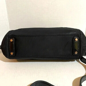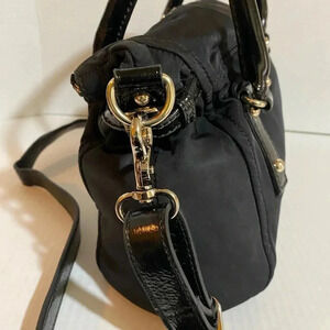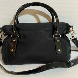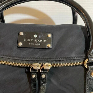 Kate spade black nylon satchel handbag with patent leather strap and trim main compartment 3 pockets at interior wall 1 zip closure & zip closure at top fabric lining snap pocket closure at front protective metal foot base lining have stains shoulder strap is replaced not Kate spade strap logo at front hight 7.5” width 10.5” depth 3.25” strap drop 6” shoulder drop 28” adjustable The dimensions are based on approximately measurements before placing an order please check take a moment to view all photos using feature for a closer look