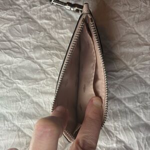 Kate Spade card case lanyard. New with tags. Pretty beige and white color. Has a clear pocket for IDs and two more slots to hold credit cards. Also features a secured zipper pocket. Can be worn with the strap around the neck or you can remove the strap and just have the clip at the top