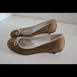 Leather upper & soles. Gold/black textured color. Cute mini silver Bow details.