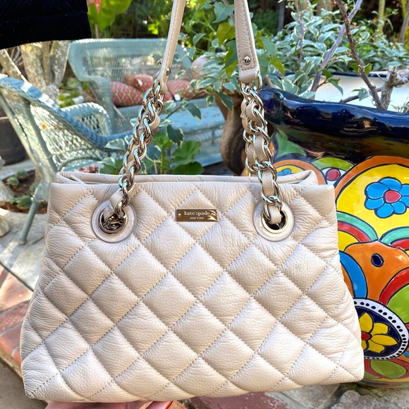 Kate Spade quilted neutral handbag with chain straps and interior button to close and secure, overall great condition.