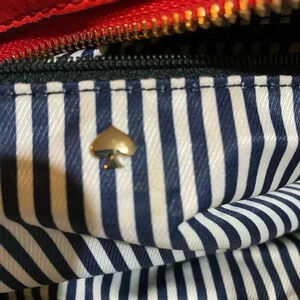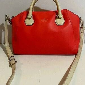 Kate spade Orange leather satchel handbag with cream strap & trim main compartment 3 pockets at interior wall 1 zip closure & zip closure at top fabric lining logo at front minor marks creasing hight 10.5” width 15” depth 4” strap drop 5” shoulder strap 21 The dimensions are based on approximately measurements before placing an order please check take a moment to view all photos using feature for a closer look