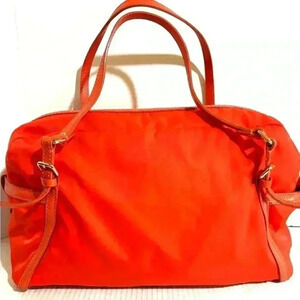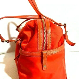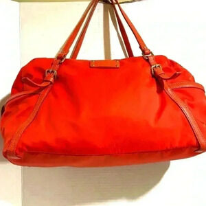 Kate spade orange nylon satchel handbag with gold tone hardware main compartment 3 pockets at interior wall 1 zip closure & zip closure at top snap pocket closure at both side logo at front fabric lining minor marks hight 10.5” wide 14” depth 6” strap drop 6” Yeah The dimensions are based on approximately measurements before placing an order please check take a moment to view all photos using feature for a closer look