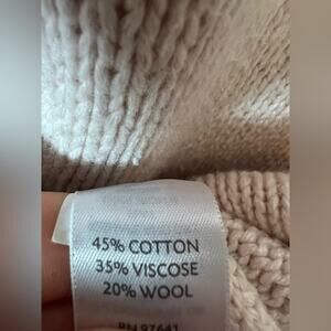 Boxy and oversized fit. Cozy and warm. Cable knit detail on the front with a mock neck. Cropped sleeve. Cotton and wool blend. Some minor wash wear, nothing really serious. Just an older piece. Approx 26.5 inches in length. 20 inches pit to pit laying flat.