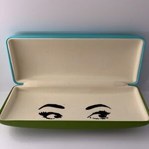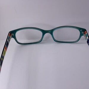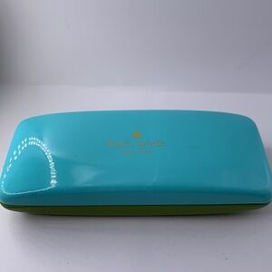 Kate spade black frames with light turquoise interior and brown stems with striped insides. In very good condition - except - some one may have nibbled on one of the ear pieces (shown) :/