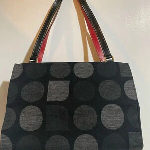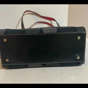 Kate spade twill black grey satchel handbag with leather strap & trim with silver tone hardware main compartment 3 pockets at interior wall 1 zip closure & snap closure at top 4 protective metal foot base lining have some stains hight 8.5” width 11” depth 4” strap drop 9”Bag dimensions are based on approximate measurements before placing an order please take a moment to view all photos using feature for a closer look