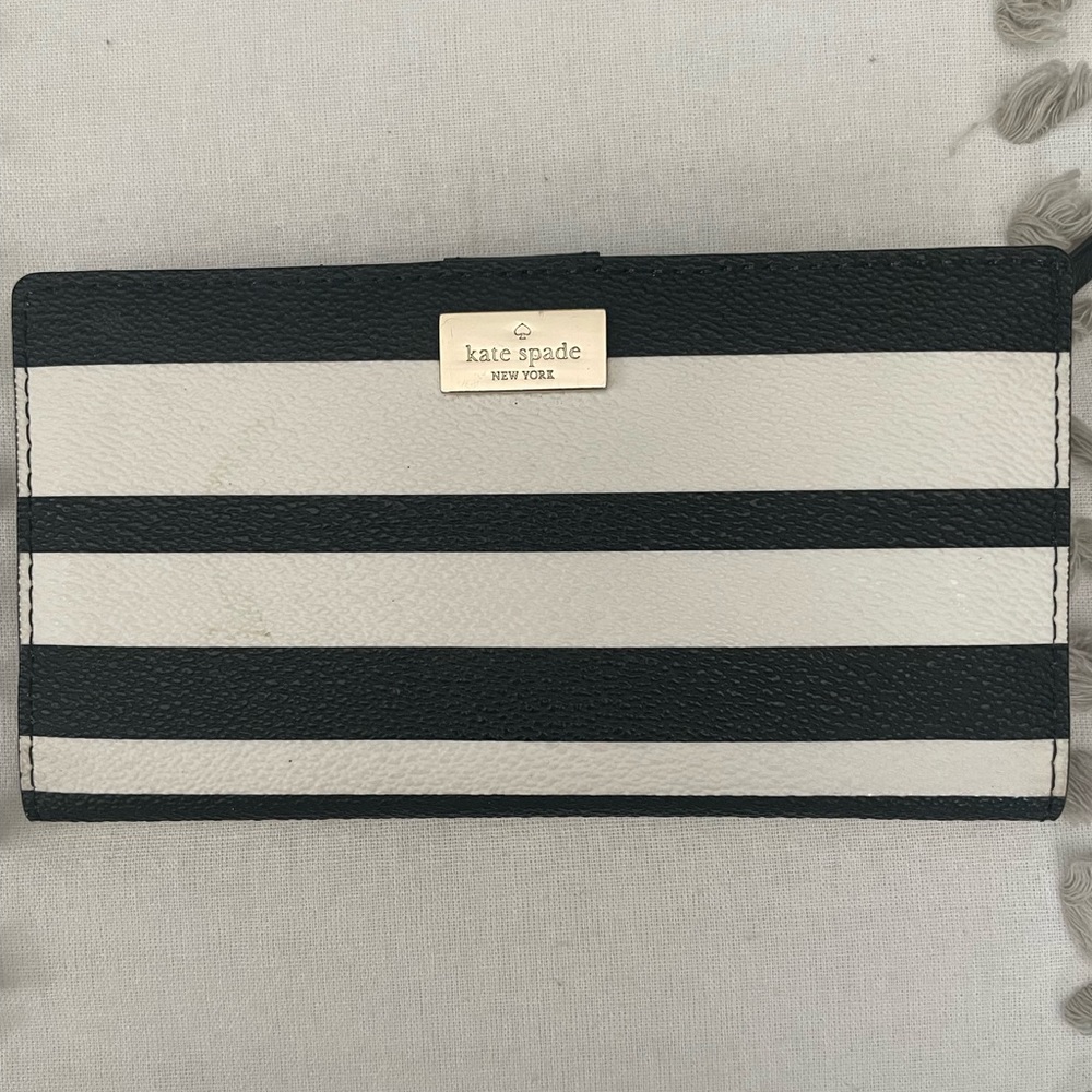 Kate spade wallet, used. Front and inside is perfect back side shows signs of some usage but may be able to clean. Durable vinyl adorable blacks no white stripe. Slim with snap closure!