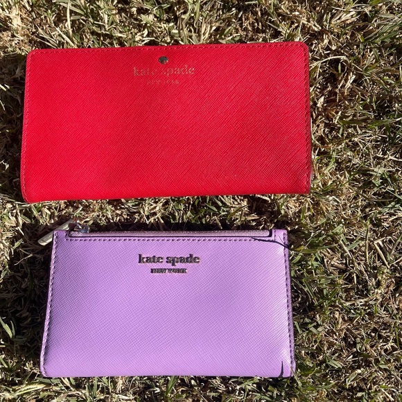 Purple wallet includes 5 cards slots plus ID compartment. Contains 2 slots to hold bills if folded. And a zipper pocket on the top of the wallet. Measures approximately 14 cm by 8.5 cm when closed.