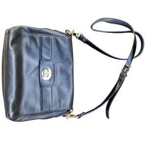 This sleek black crossbody bag features a structured yet slightly slouchy design, crafted from smooth leather with a subtle sheen. The adjustable shoulder strap offers versatility, while the gold-toned hardware adds a touch of elegance. Perfect for everyday use, this bag combines timeless style with practicality.