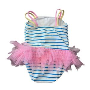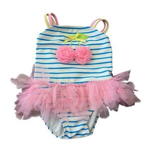 Charming swimsuit with blue stripes and white stripes with soft pink netting cherry accents. Ideal for poolside fun. Smoke free. Size 12months preowned.