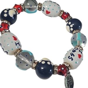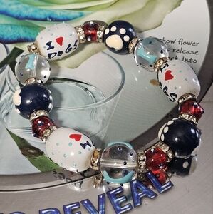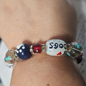 Colorful beaded bracelet with heart designs and 'I love dogs' beads. Features a mix of red, blue, and white beads. Perfect for casual wear, dog lovers in particular, stretch bracelet