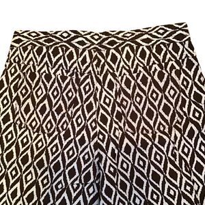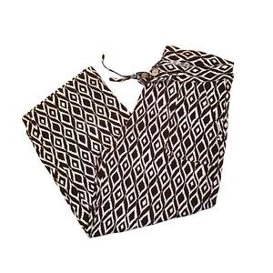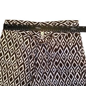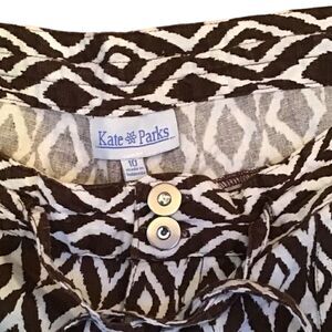 Upgrade your summer wardrobe with these stylish Kate Parks linen capri pants. The geometric pattern in brown and cream will surely make heads turn. The pants feature a zip and button closure, easy care, and pockets for added convenience.