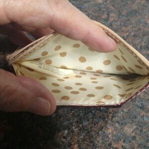New case in perfect condition. It measures about 4.25" x 3". The logo is clear and showy. There are three outside slots. The interior slot can hold money and additional cards. The polka dot interior is soooo cute. If it had tags you would think it was new and it is.