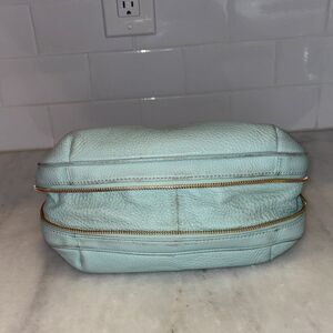 Authentic designer Kate Spade Cobble Hill Ella Pebbled Leather Expandable Convertible Shoulder Bag in EUC. Kate Spade Cobble Hill Mini Ella Two-Way Crossbody Bag in Grace Blue. This bag is a versatile two-way design, functioning as both a shoulder bag with a short top handle and a crossbody bag with a removable, adjustable long strap. It features a hobo-style silhouette with a soft, pebbled leather exterior. It is crafted from finely pebbled leather in a color described as "Grace Blue," which is a light blue shade, often appearing as a blend between robin's egg blue and mint green or teal. It has a secure zip-top closure. Includes a slender top carry handle and an optional, adjustable crossbody strap for varied styling. The interior features a zip pocket and wall pockets for organization, and it may have signature stripe lining. A distinctive feature is the cool zip detailing along the curved bottom, which can also function as a gusset to expand the bag's capacity. Approximate measurements - 11.5" x 9.75" x 3" (but can be expanded when the zipper is opened). Photos are the most accurate description of this beautiful kate spade bag. Zoom on photos, ask questions and make an offer!