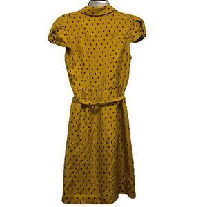 Mustard and chocolate Kate Spade New York silk knee-length dress with pointed collar, cap sleeves, dual seam pockets at sides, pleated detailing at skirt, sash tie accent at waist, owl print throughout and gold-tone button closures at front.
