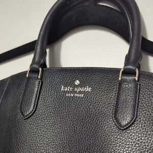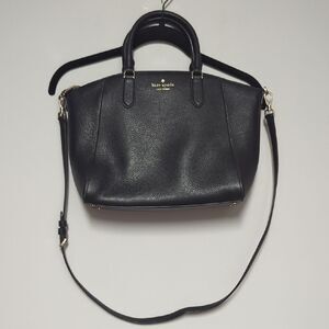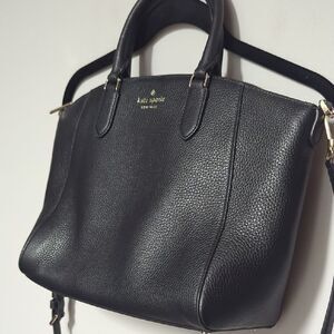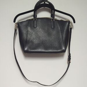 Chic black leather satchel. Features top handles and detachable adjustable strap. Perfect for everyday elegance.