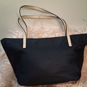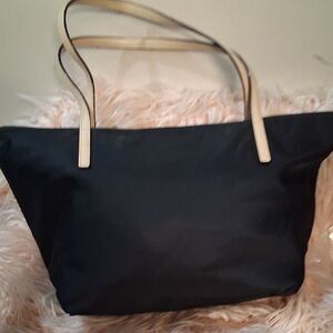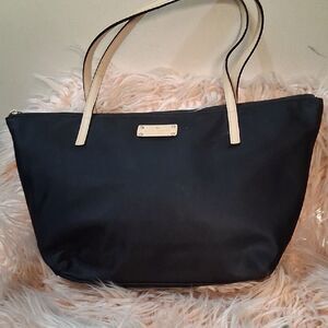 Chic Kate Spade tote with navy body. Cream handles add contrast. Ideal for daily use.