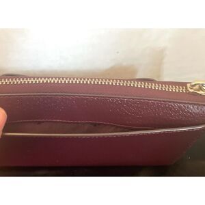 Kate Spade Burgundy Leather Wallet with Bow Accent MATERIAL Crosshatched leather with matching trim Capital kate jacquard lining 14-karat light gold plated hardware FEATURES Zip around continental wallet 8 credit card slots; 3 billfolds; interior zip pocket; exterior slide pocket Gold printed KSNY signature and light gold spade stud DETAILS 3.5" x 6.6" x 0.8"