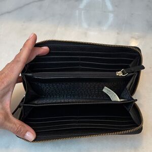 Authentic Kate Spade Colorblock Saffiano Leather Full Zip Continental Wallet. Beautiful pink, plum, tan, cream and black colorblock pattern covers this full sized wallet. Imperfections can be seen on both the front and back. Gold toned hardware is a great accent. Accordion style flexibility makes this wallet great for storing all of your needs. Full zipper opens to black leather interior with black logo fabric. 12 card slots, 2 cash slots, 2 larger compartments and a full zipper compartment. Full size slip pocket on the back of the wallet. Approximate measurements - 7.5" x 4" Photos are the best detailed description of this classic ks wallet. Zoom on photos, ask questions and make an offer!!