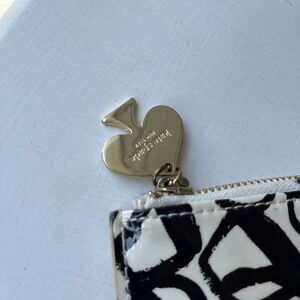 Playful and bold, this Kate Spade New York zip pouch features a glossy patent-style exterior with an allover black eyeglass print on a creamy white background. The gold spade zipper pull adds a signature touch of shine and whimsy. Measures approximately 8.5" wide by 5.25" tall—perfect for carrying essentials as a clutch, wallet, or organizing pouch in your tote.