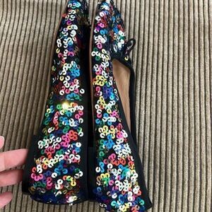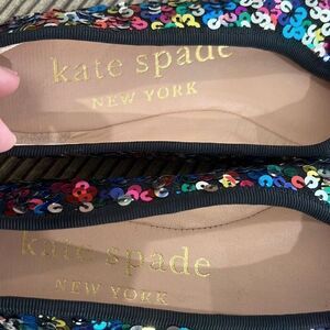Kate Spade Honey Flat, multi-color sequin, with black trim and front tie. Super classy, fun and all season. All sequin is in tact. No pulls & no stains.