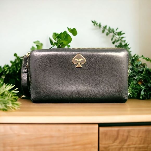 This is a beautiful, pre-owned Kate Spade black leather wallet with numerous card slots and inside zipper for coins with an additional outer pocket.