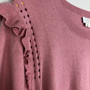 Beautiful pink sweater, shade is called faded peony. Has eyelet detail and ruffles at shoulders/sleeves, round neckline, short sleeves, ribbed at sleeve cuffs, neckline and hem. Very soft material.