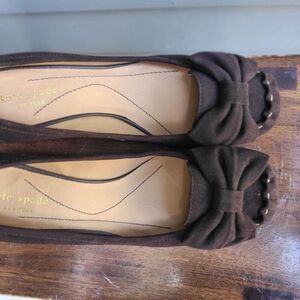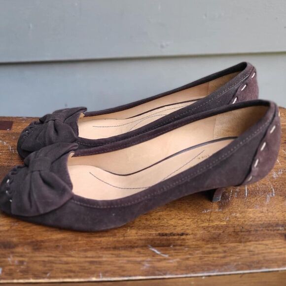 I purchased these shoes in 2007 and they are drop dead gorgeous. Brand new. Brown suede with a bow and contrast stitching. Kitten heels.