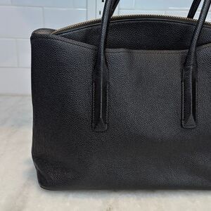 Authentic Kate Spade Margaux Saffiano Leather Large Convertible Satchel Shoulder Bag is preowned in EUC. Elevate your style with the Kate Spade Black Leather Tote Bag. Perfect for any occasion, this elegant bag combines functionality with timeless design. The sleek black color adds a touch of sophistication to your ensemble. This satchel is characterized by its curved, feminine silhouette and molded top handles. It is crafted from refined grain leather with matching trim and features a faux-leather lining. The front of the bag prominently displays the "kate spade new york" foil embossed logo.