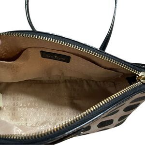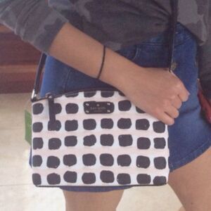 This Kate Spade crossbody bag showcases a striking polka dot pattern with bold black dots on a crisp white background. Its sleek design features a thin black strap, perfect for wearing across the body or over the shoulder, making it a stylish and practical accessory for any occasion.