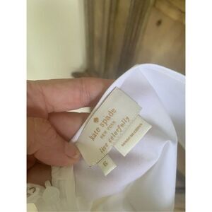 Kate Spade New York Bow Peplum Top. It is a white, sleeveless top with a large bow detail at the waist. The top has a peplum hem and a round neckline. It is made of cotton and spandex. Size 6 in great condition.