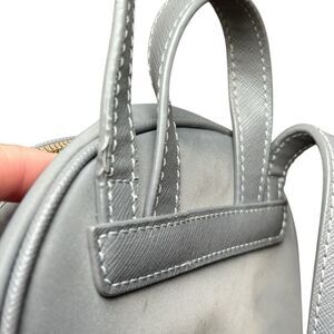 SEE PHOTOS FOR CONDITION. The Kate Spade New York Bradley Mini Backpack in grey is a stylish and practical accessory for women on the go. This semi-oval shaped backpack features a zip closure, gold hardware accents, and a monogram lining. Made with nylon exterior material and polyester lining, it is perfect for travel, casual outings, or business meetings. The gray exterior color and top handle style add a touch of sophistication to the classic and preppy design. The backpack also features a matte finish, nylon handle/strap material, and a 24-inch strap drop for comfortable wearing.