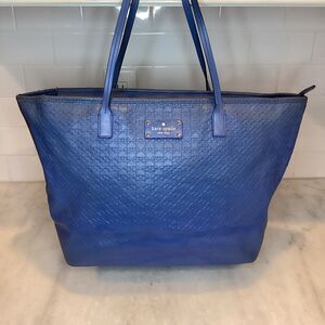 Authentic Kate Spade New York Penn Place Margareta Tote with perforated leather with Kate Spade Logo. This spacious, stunning light royal blue tote from Kate Spade features a textured design with a subtle pattern, offering a chic and classic look. Its sturdy double handles and wide opening make it perfect for everyday use, while the slight sheen adds a touch of elegance. It is a large, stylish, and functional tote bag designed for everyday use. It's made of embossed leather and features a classic silhouette. The tote has a spacious interior, with interior pockets, and is known for its durability and ability to carry heavy items. Interior needs a cleaning. Approximate dimensions of 12.75 inches in width, 11.5 inches in height, and 6 inches in depth. Photos are the best description of this stunning bag. Ask questions and make an offer!!