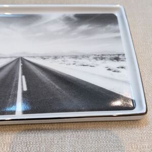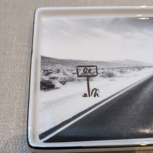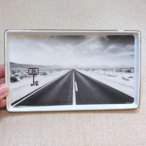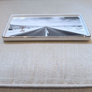 Kate Spade New York x Lenox Spirit of Adventure White Ceramic Tray with a gold rim. This fun tray displays the open road that leads to your next adventure!