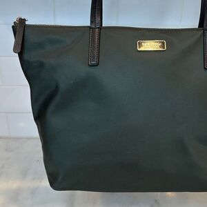 Authentic designer Kate Spade Nylon Full Zip Medium Tote Shoulder Bag in preloved condition. Chic and spacious Kate Spade tote. Dark green with sleek black handles. Ideal for everyday use. Gold hardware accents. Full zipper top protects black spade logo fabric with two slip pockets and a zipper compartment. This bag is super light weight. Double handles show cracking and peeling, bag is priced accordingly. Approximate measurements -11.5" across the bottom of the bag, 15" across the top of the bag, 9.5" height, 5.25" width. Strap drop - 10" Photos are the most detailed description of this pretty hunter green tote.